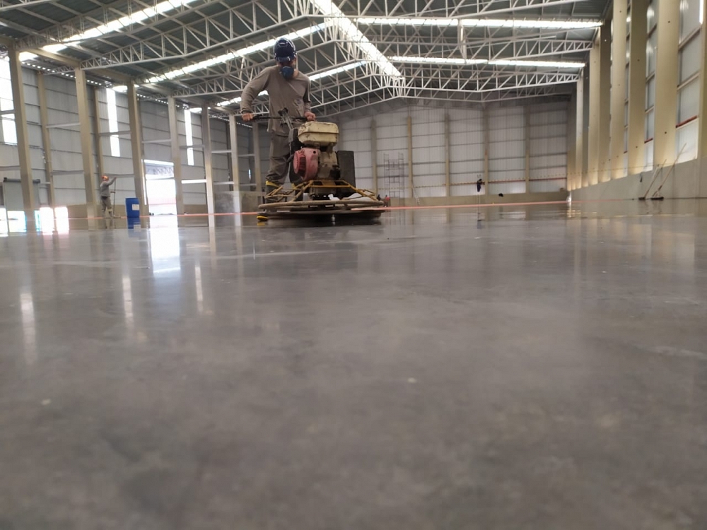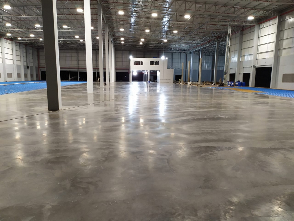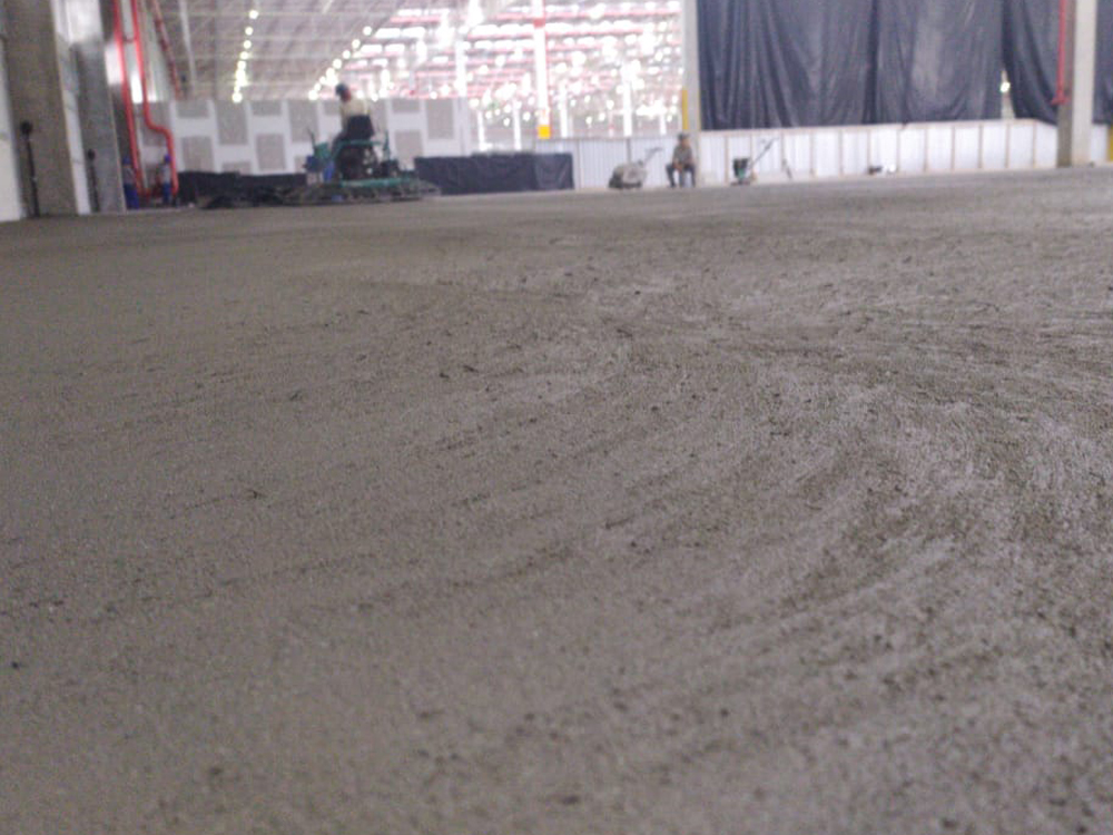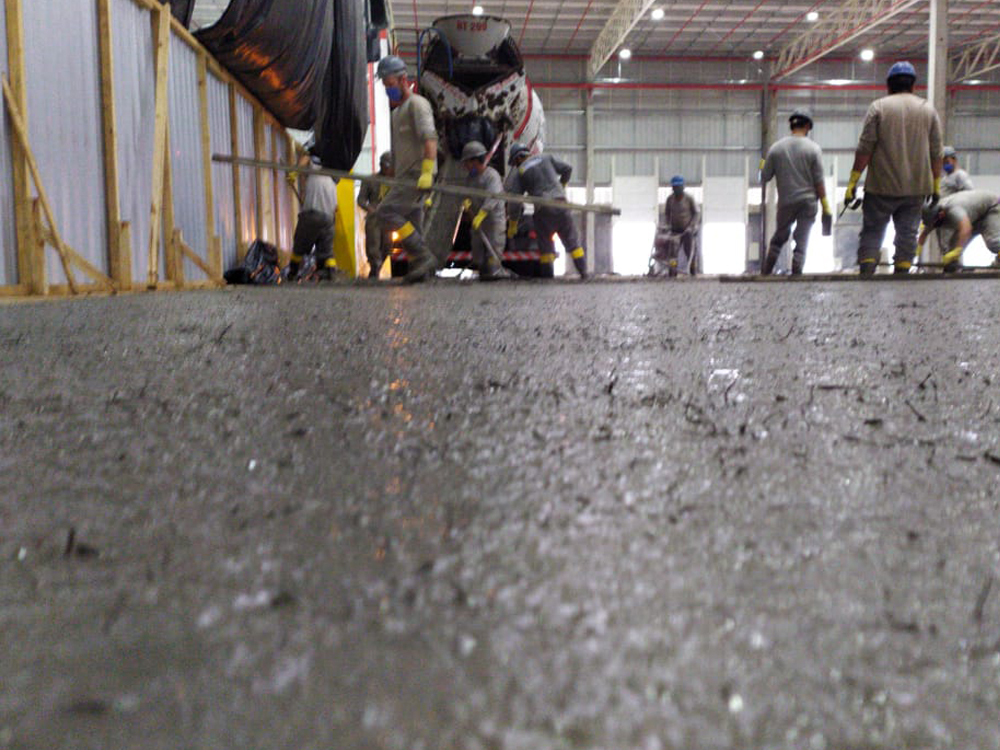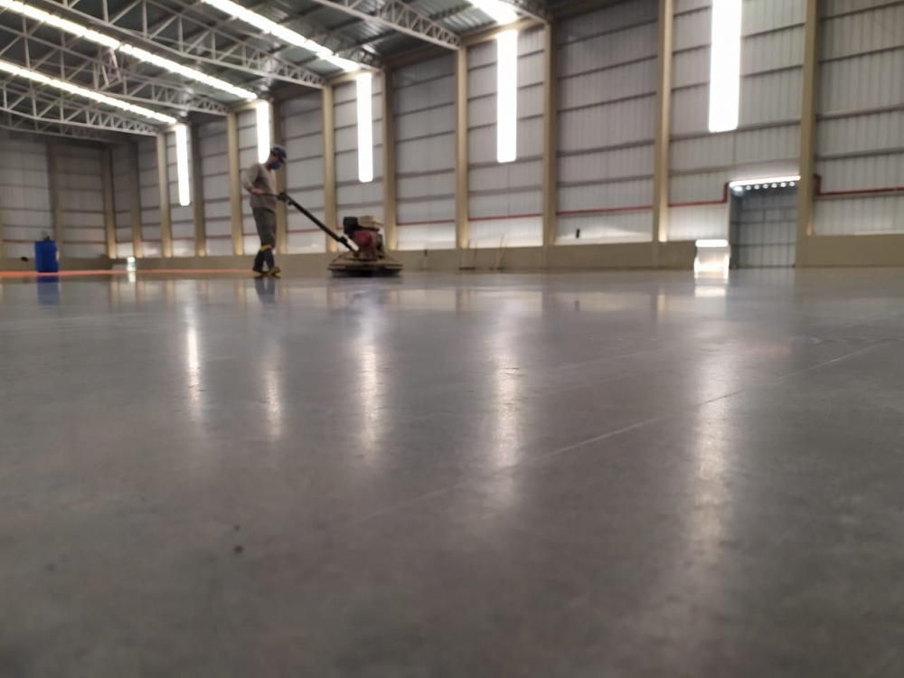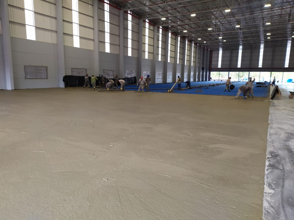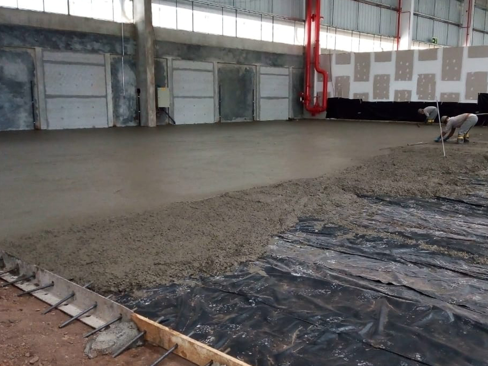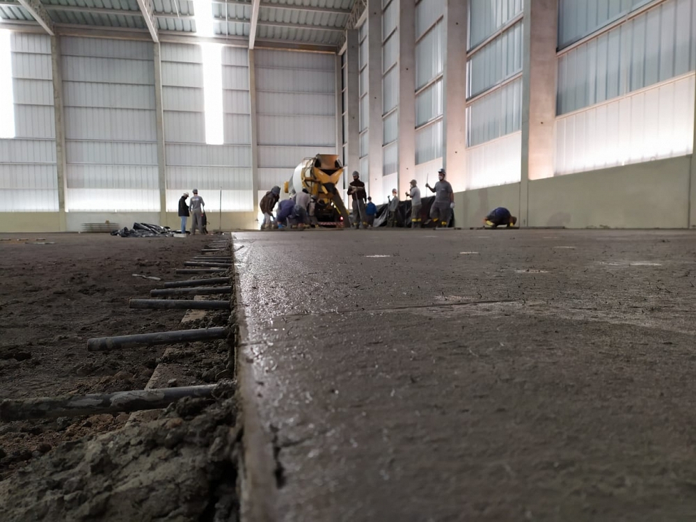 Piso industrial com adição de Macrofibra Sintética e aplicação de endurecedor de superfície.