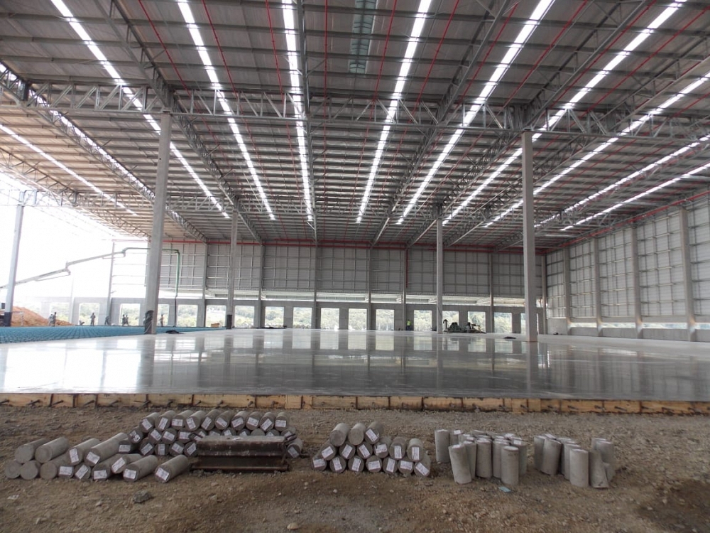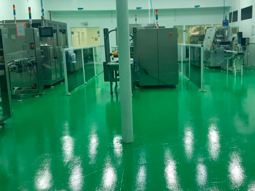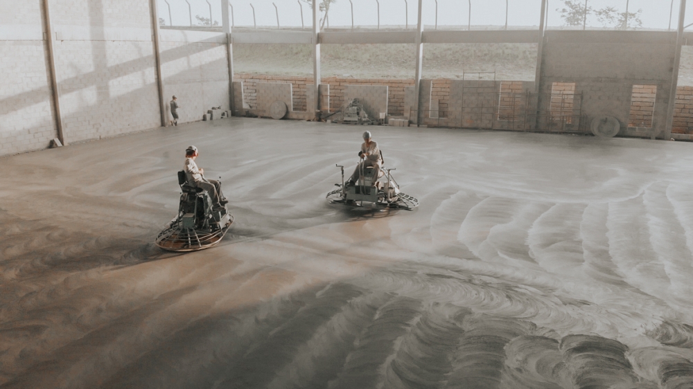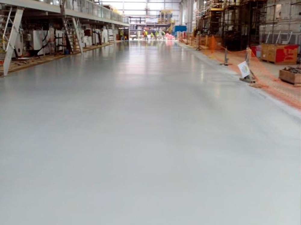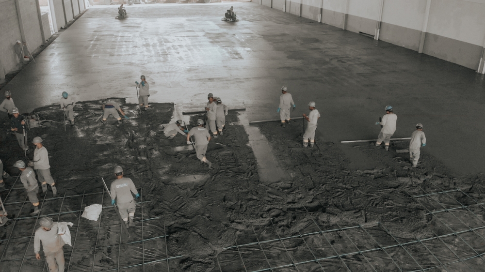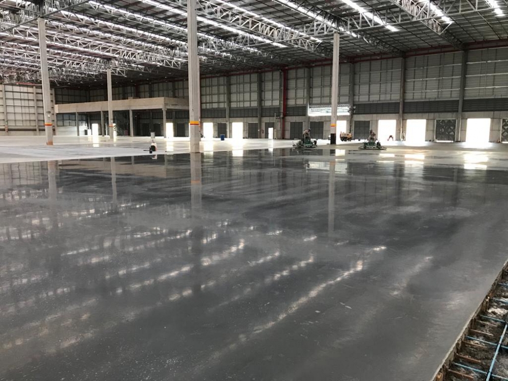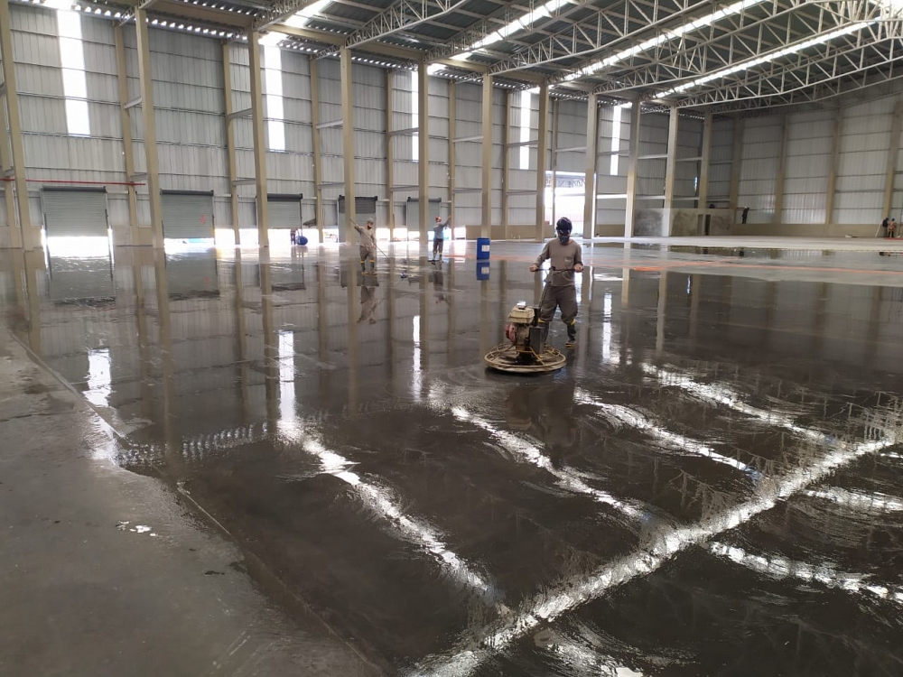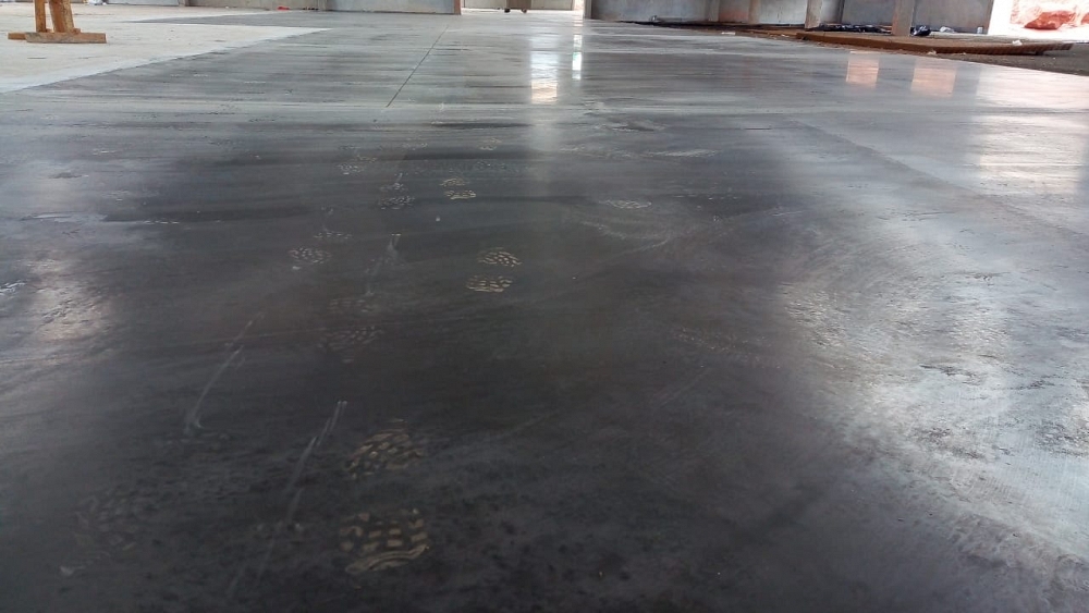 Piso industrial com adição de Macrofibra Sintética e aplicação de endurecedor de superfície.