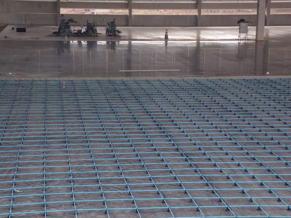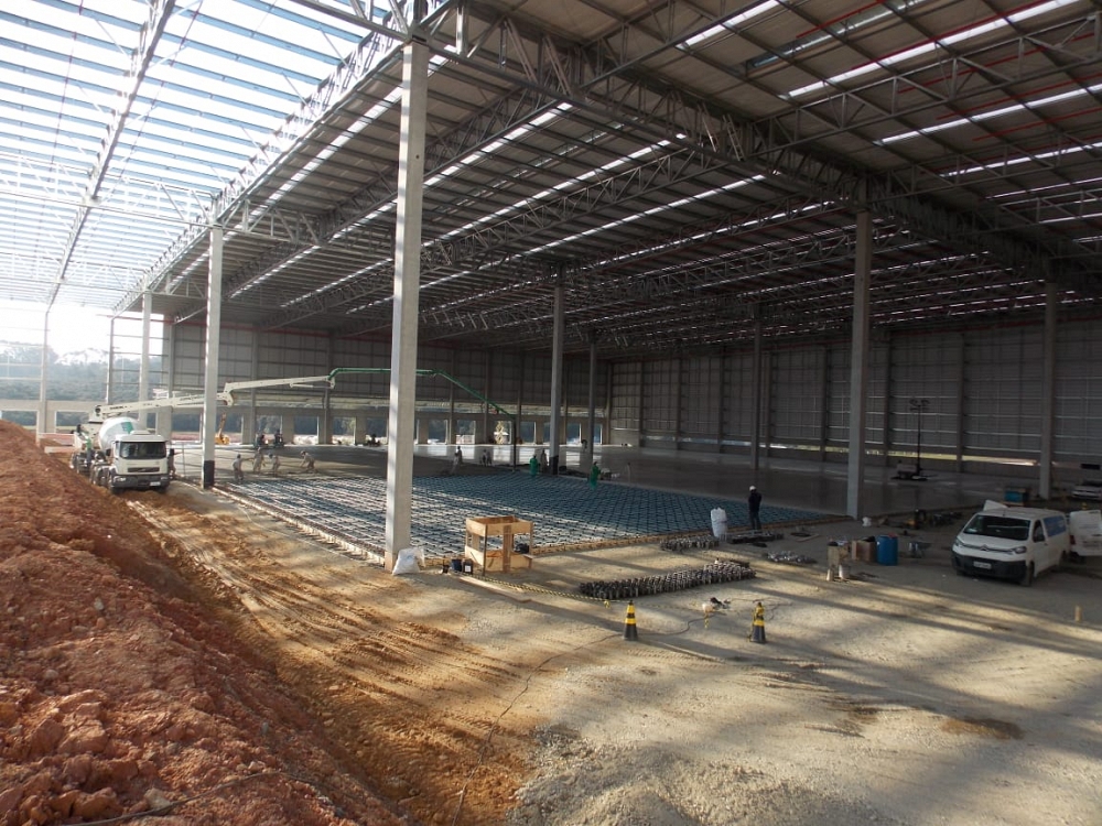 Piso reforçado com Macrofibras Sintéticas nas áreas de cargas distribuídas e telas duplas nas áreas com cargas pontuais elevadas.