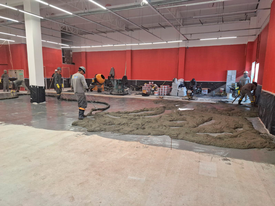 Lançamento e acabamento de piso em concreto com aplicação de endurecedor.