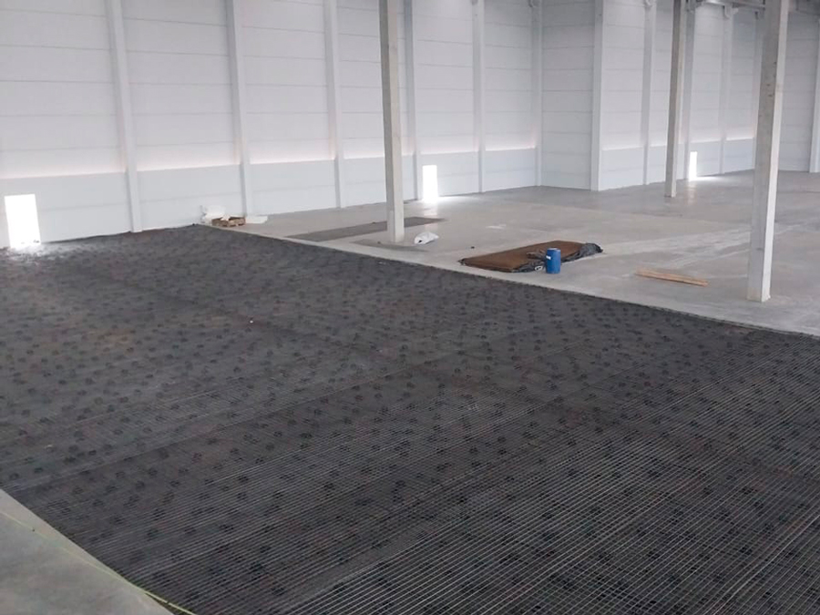 Piso com tela dupla e macrofibra para um pavilhão autoportante