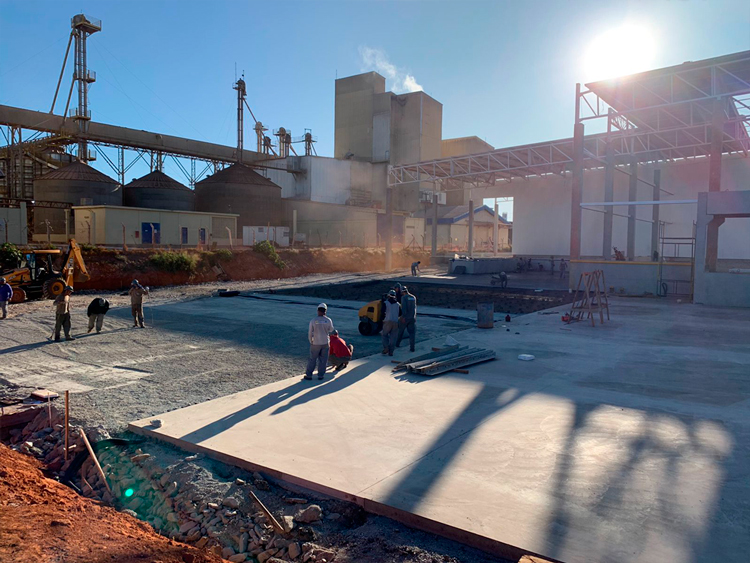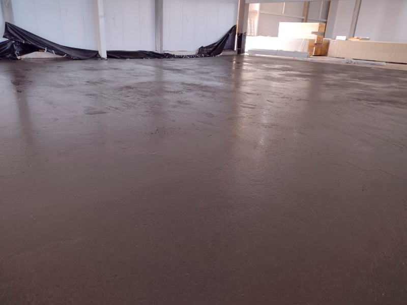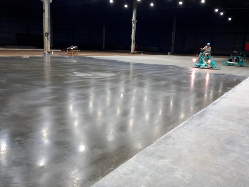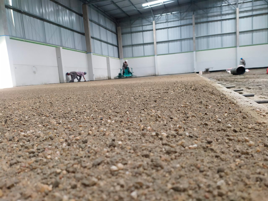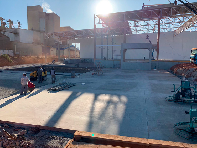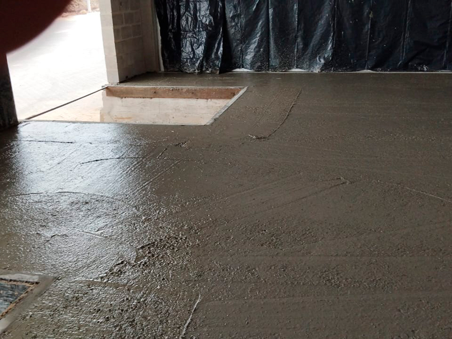 Execução de 562,50m² de piso em concreto apoiado sobre o solo e 645,00m² de capeamento de laje alveolar.